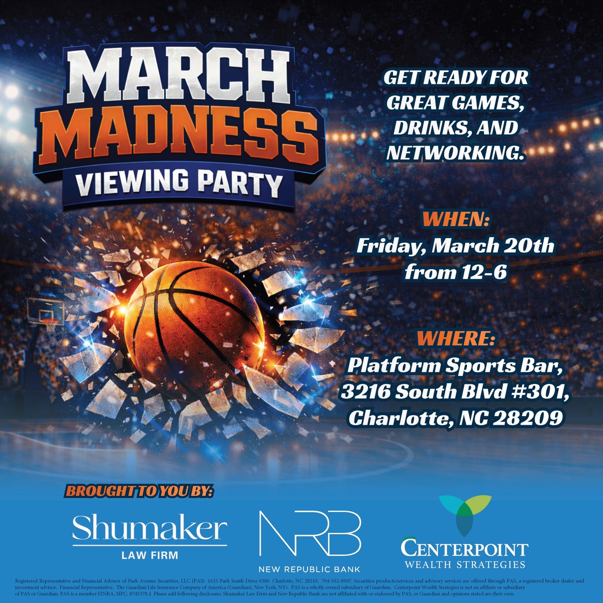 Join us for the 8th Annual March Madness Watch Party—because nothing says “client appreciation” like hoops, great company, and zero pressure to fill out a perfect bracket! On Friday, March 20th, from 12:00–6:00 PM at Platform Sports in Charlotte (your front-row seat to every buzzer-beater on massive screens), we’re rolling out the red carpet with delicious food, cold drinks, and that perfect mix of old friends catching up and new connections sparking over shared cheers (or groans). Pop in during your lunch break for a quick escape, sneak out early to kick off the weekend, or settle in for the full afternoon of first-round madness—it’s your call. We’ve been doing this the last 8 years because we love seeing familiar faces and making new ones, so come root for your team (or just the drinks) and let’s make some memorable moments together. RSVP soon—